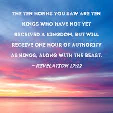 12 The ten horns which you saw are ten kings who have received no kingdom as yet, but they receive authority for one hour as kings with the beast. 13 These are of one mind, and they will give their power and authority to the beast. (Revelation 17:12-13)
