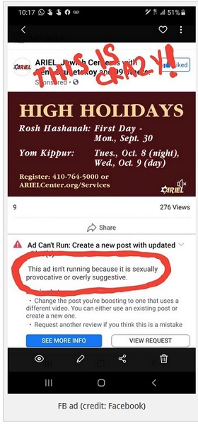 Facebook has banned an advertisement promoting the Jewish High Holidays of Rosh Hashannah and Yom Kippur saying that the ad is “sexually provocative or overly suggestive”. …